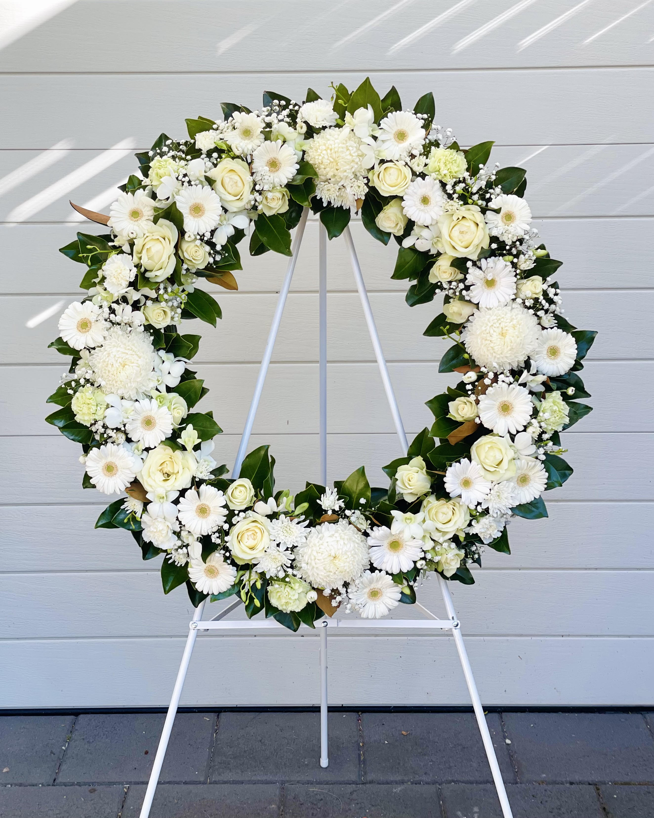 A beautiful symbol of life, a floral tribute is a wonderful way to express your feelings for a friend or loved one. A wreath made with beautiful all-white flowers and seasonal greeneries. Available in three sizes. The image shown is a Extravagant size.