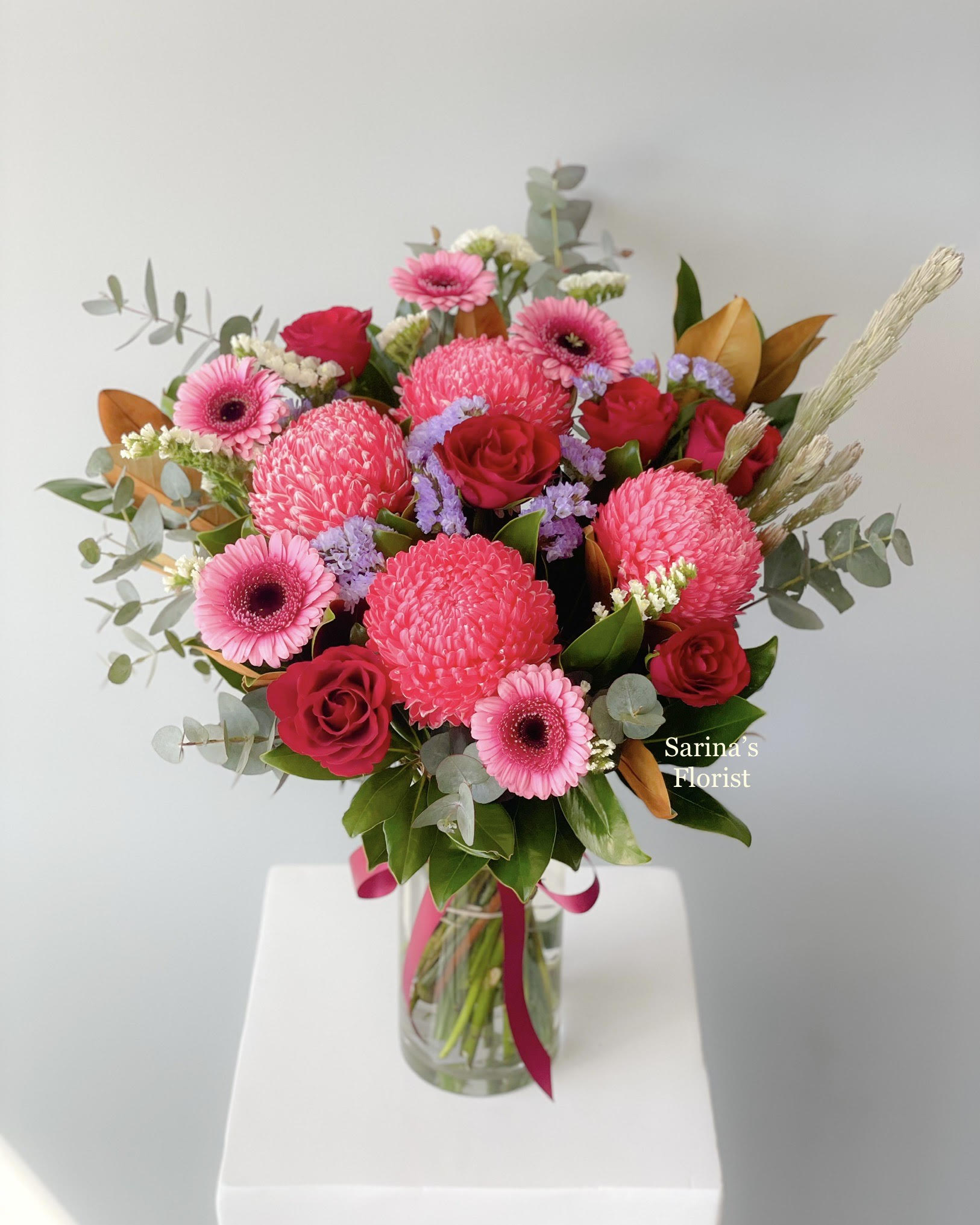 You are my sweetheart vase with red big Chrysanthemums, Gerberas, small roses, and seasonal greenery. Available in three sizes. The image shown is a Standard size.