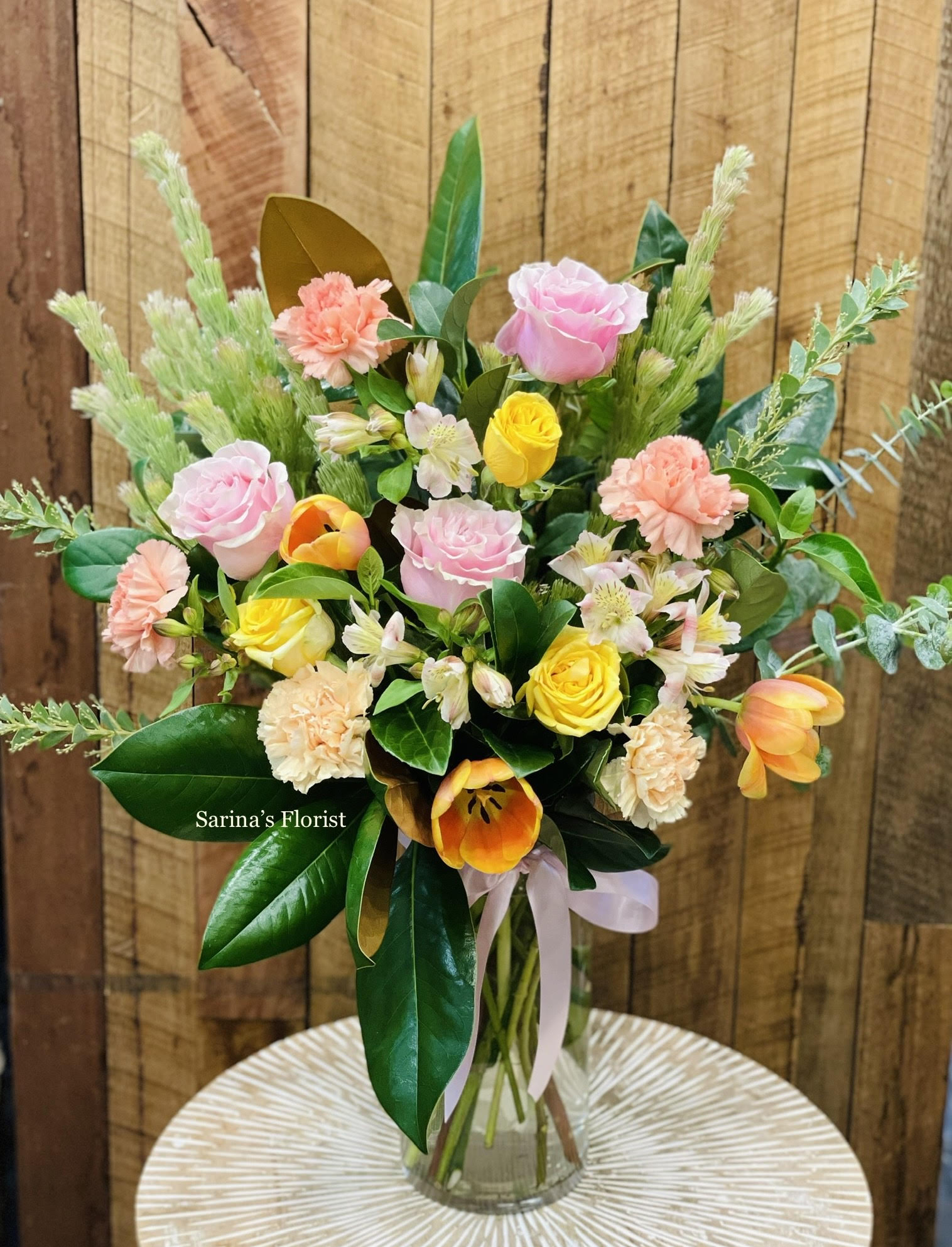 Beautiful Wish vase arrangement with soft pink, yellow, peach and orange color blooms. Available in four sizes. The vase shown is a standard size.