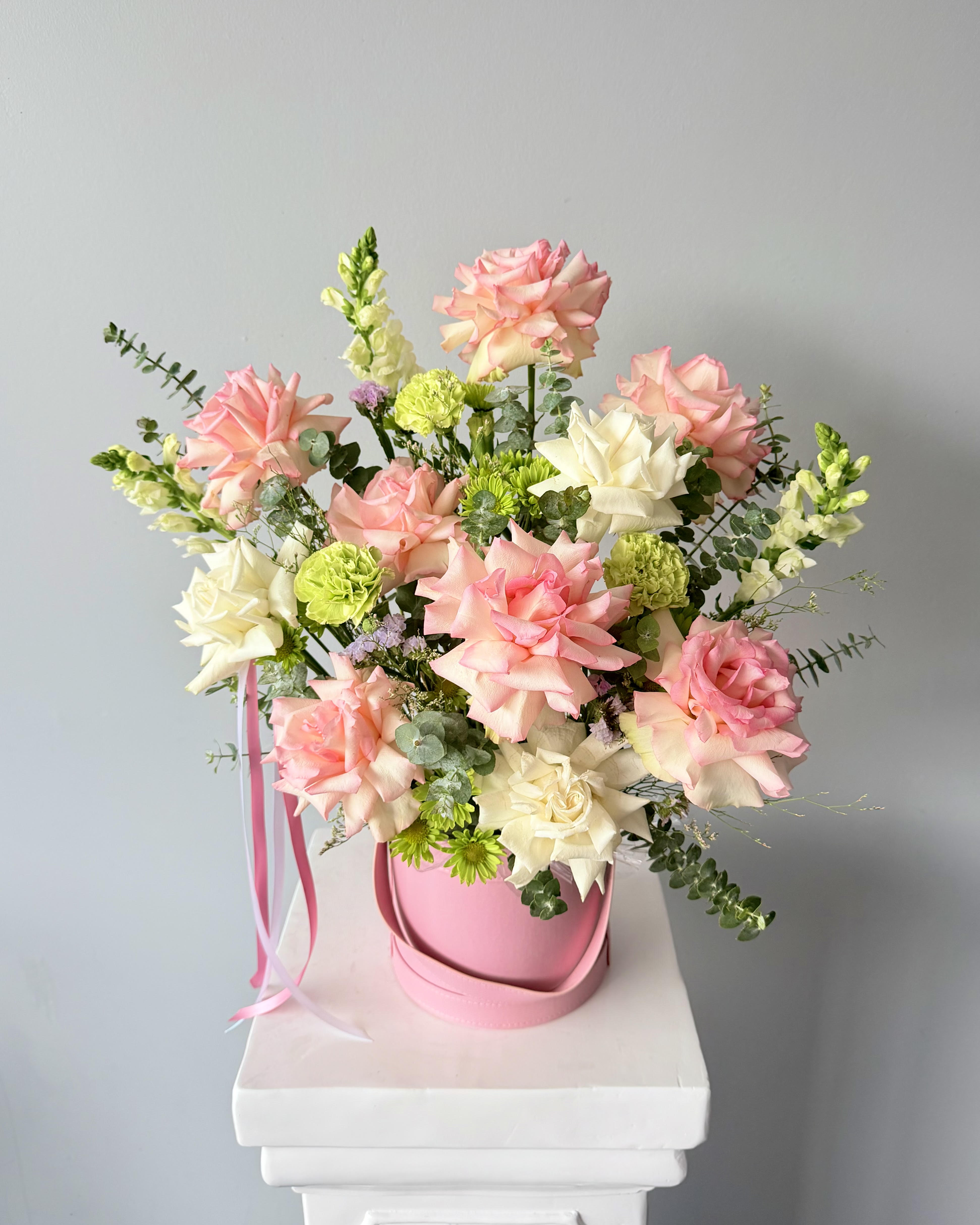 Arranged in a leather hat box, this arrangement is designed to express grace and love. Featuring delicate pink roses and classic white roses, it is beautifully complemented by fresh green carnations and playful green daisies, adding a modern touch of texture and vibrance. This design brings a natural, garden-inspired feel while maintaining a refined and luxurious look. Perfect for birthdays, anniversaries, new babies, or simply to brighten someone’s day, this arrangement speaks gently yet beautifully — a true expression of sweetness and sophistication.