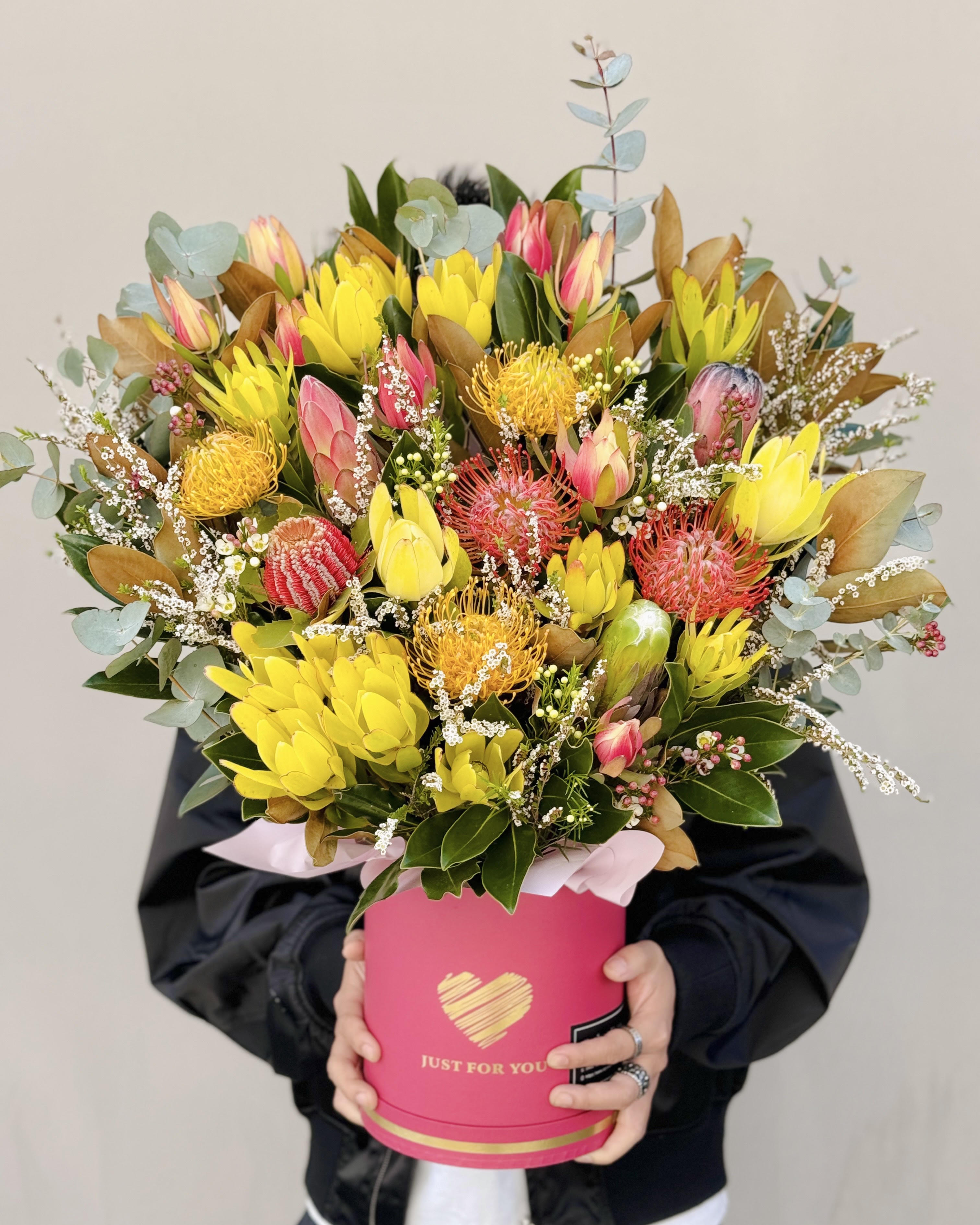 Hat box arrangement with seasonal native flowers and greeneries. Available in three sizes. The image shown is a Deluxe size.