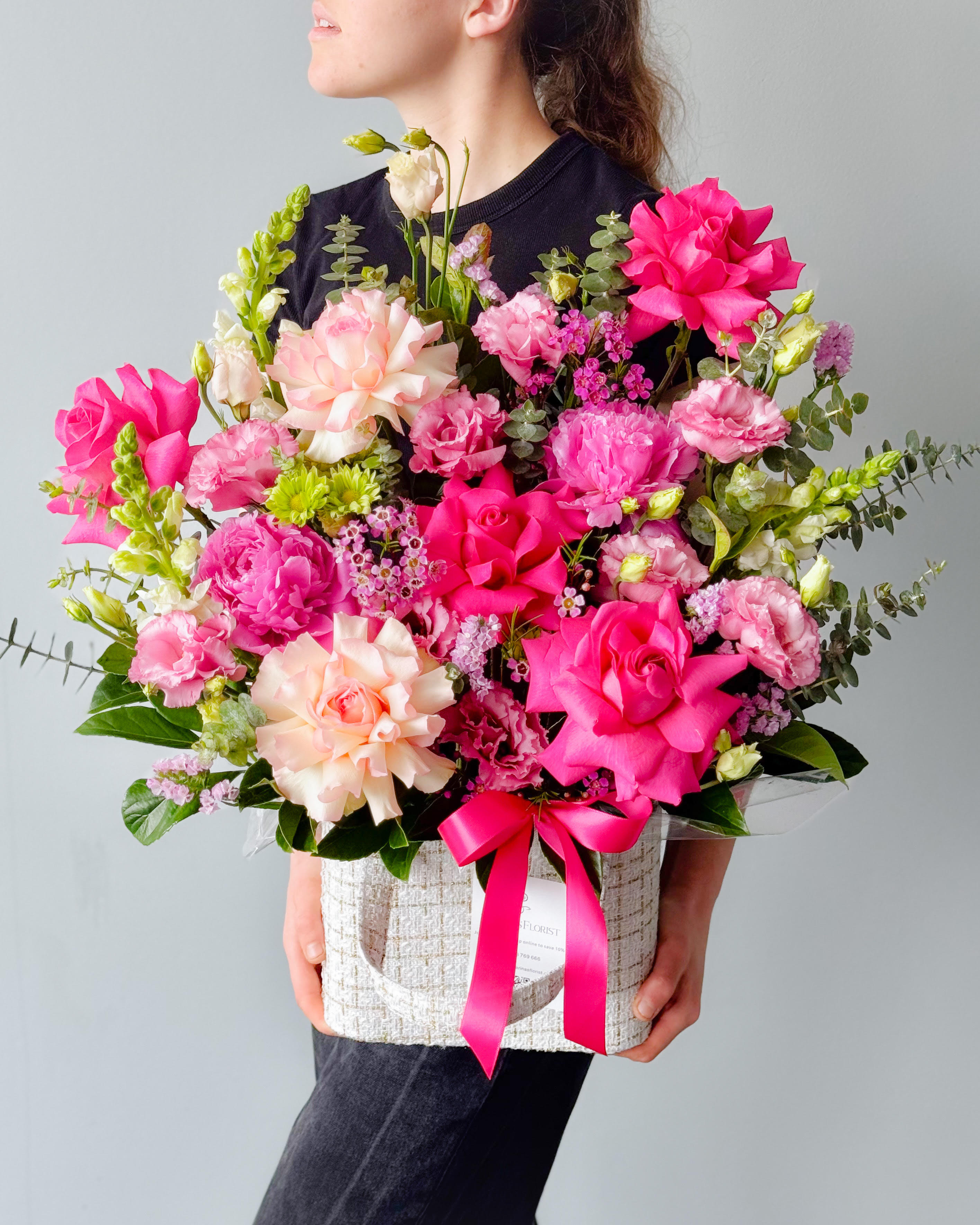 Coco flower basket with premium Hot pink Floyd rose, light pink rose, white snapdragons, and seasonal greeneries.