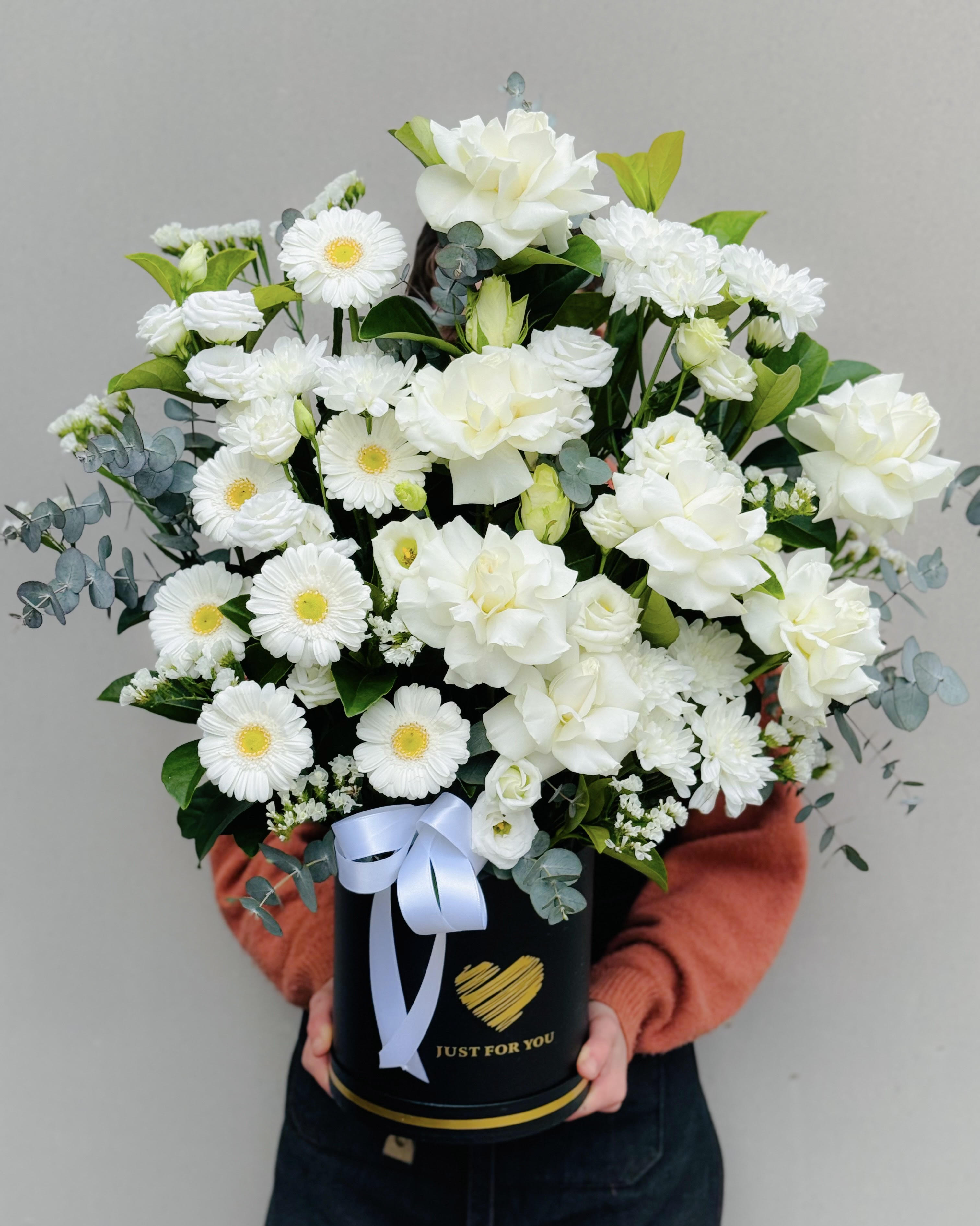 Precious Memories Flower Box with beautiful array of flowers tastefully arranged in a premium hat box. Suitable for Chapel or Church funeral services.