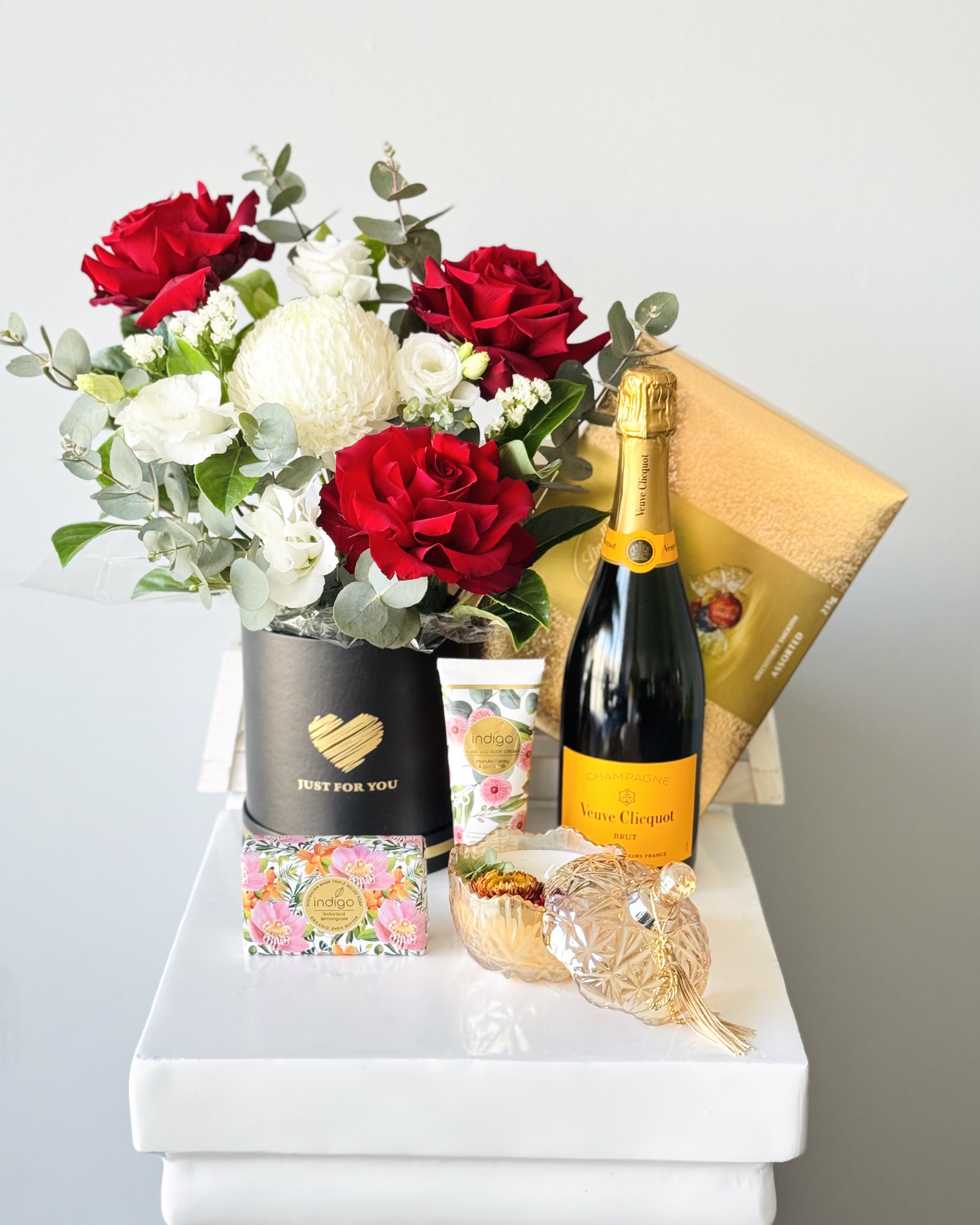 Attention: Flowers and gifts in the hamper may not be the same as it is shown in the photo. The color of the gifts will be the florist's choice.