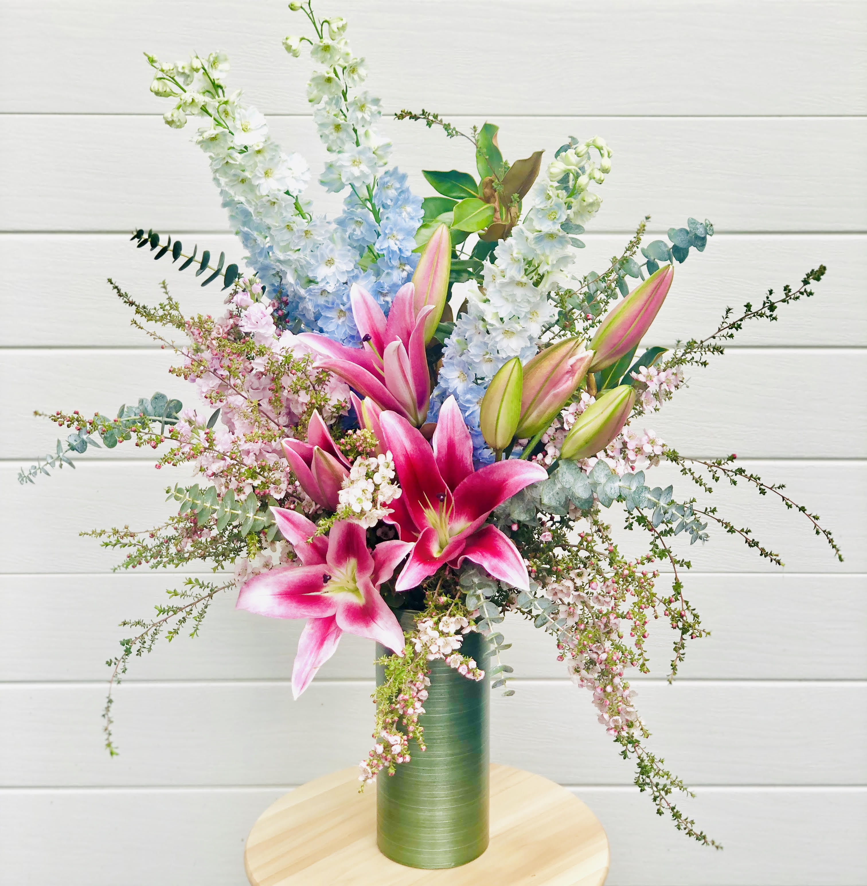Vase arrangement using oriental lily, delphinium, stock, wax flower and greenery. Suitable for corporate, wedding,birthday, anniversary,get well, surprise or even just something nice and passionate for home.
