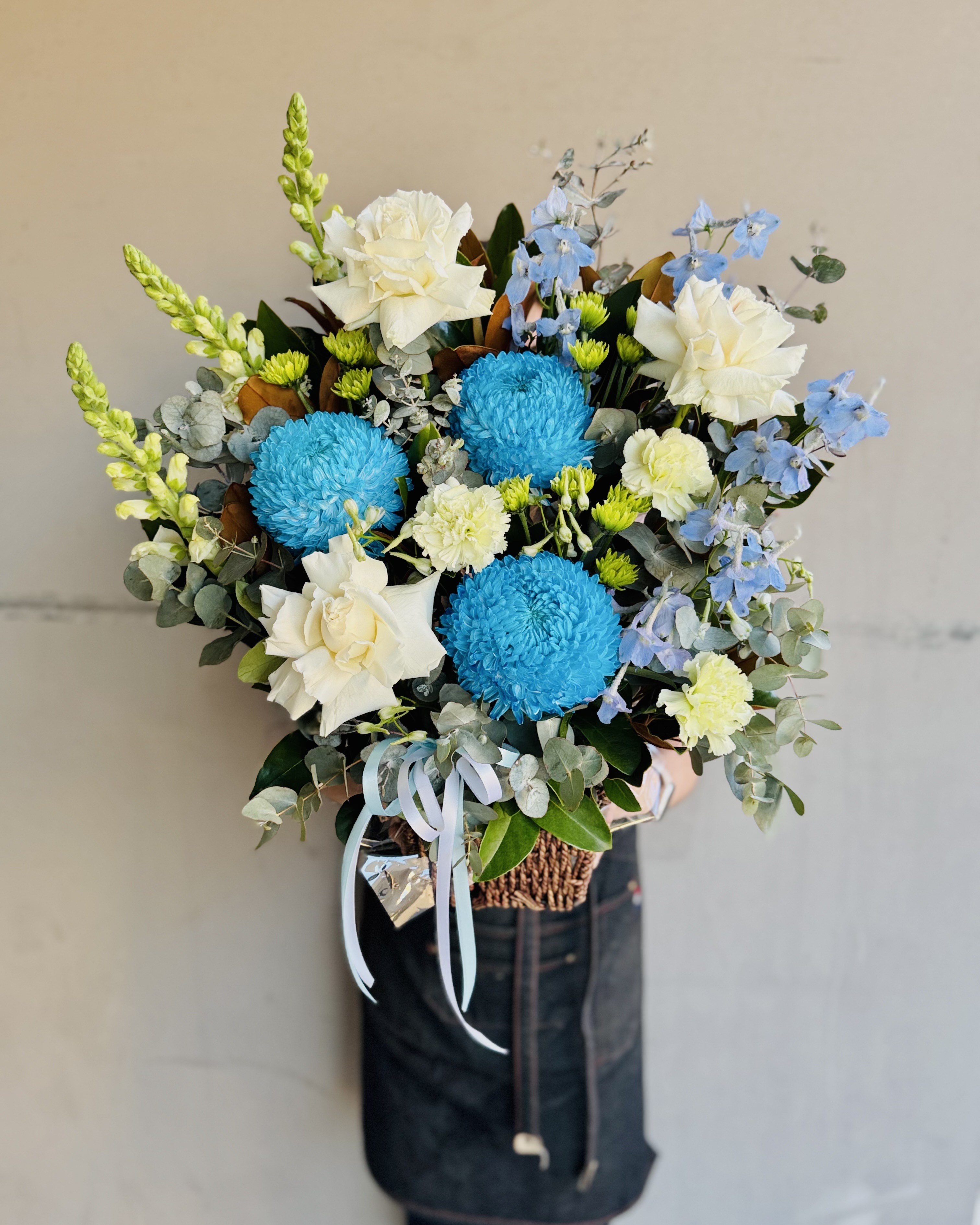 Luxury Blue And White Flower Basket with big blue chrysanthemum, white roses, and seasonal greeneries.
