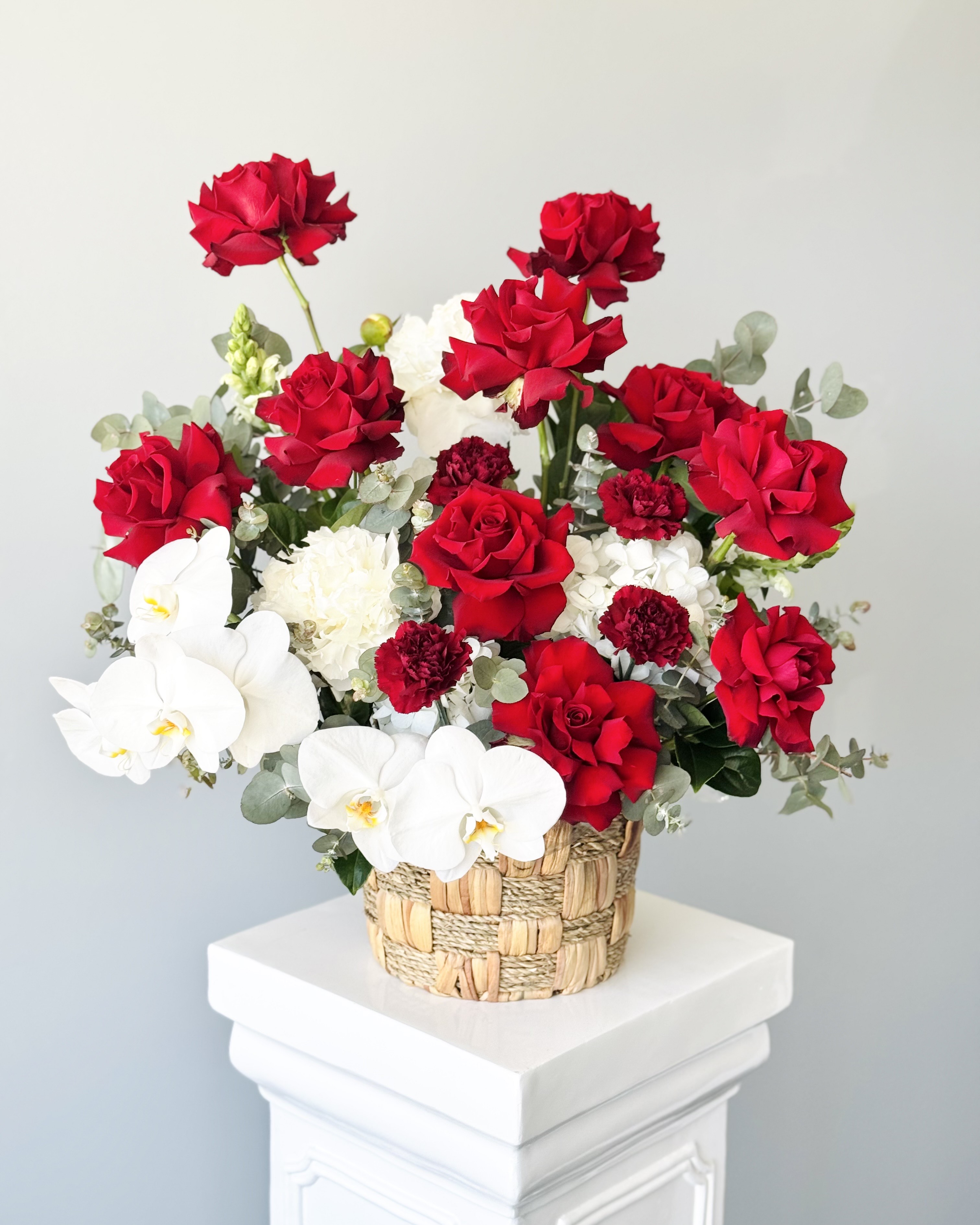 Premium red roses, white phalaenopsis orchid, burgundy carnations, and seasonal greeneries are arranged nicely in a pretty basket.