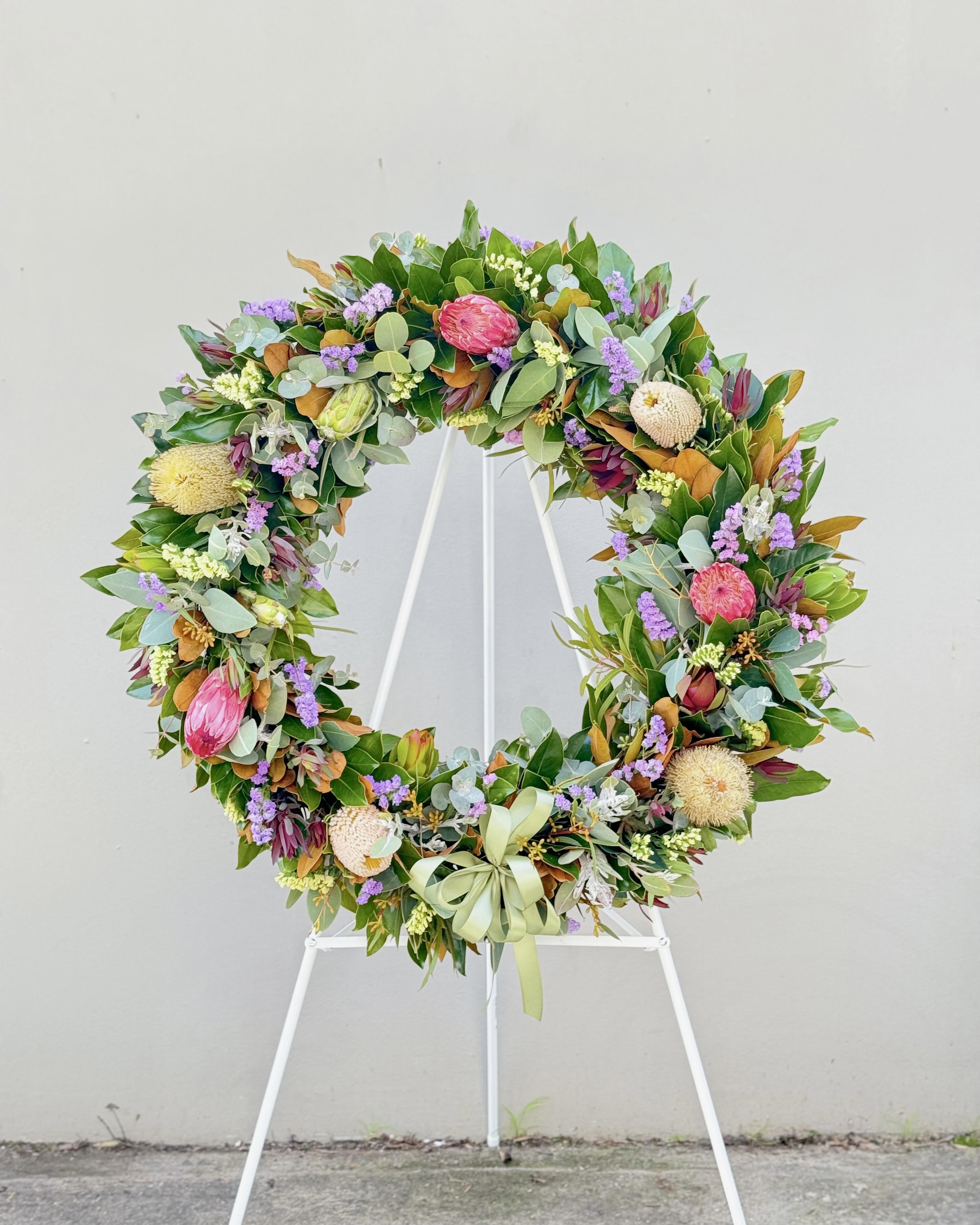 A beautiful symbol of life, a floral tribute is a wonderful way to express your feelings for a friend or loved one. A wreath made with beautiful native flowers and seasonal greeneries. Available in three sizes. The image shown is a Extravagant size 65cm.