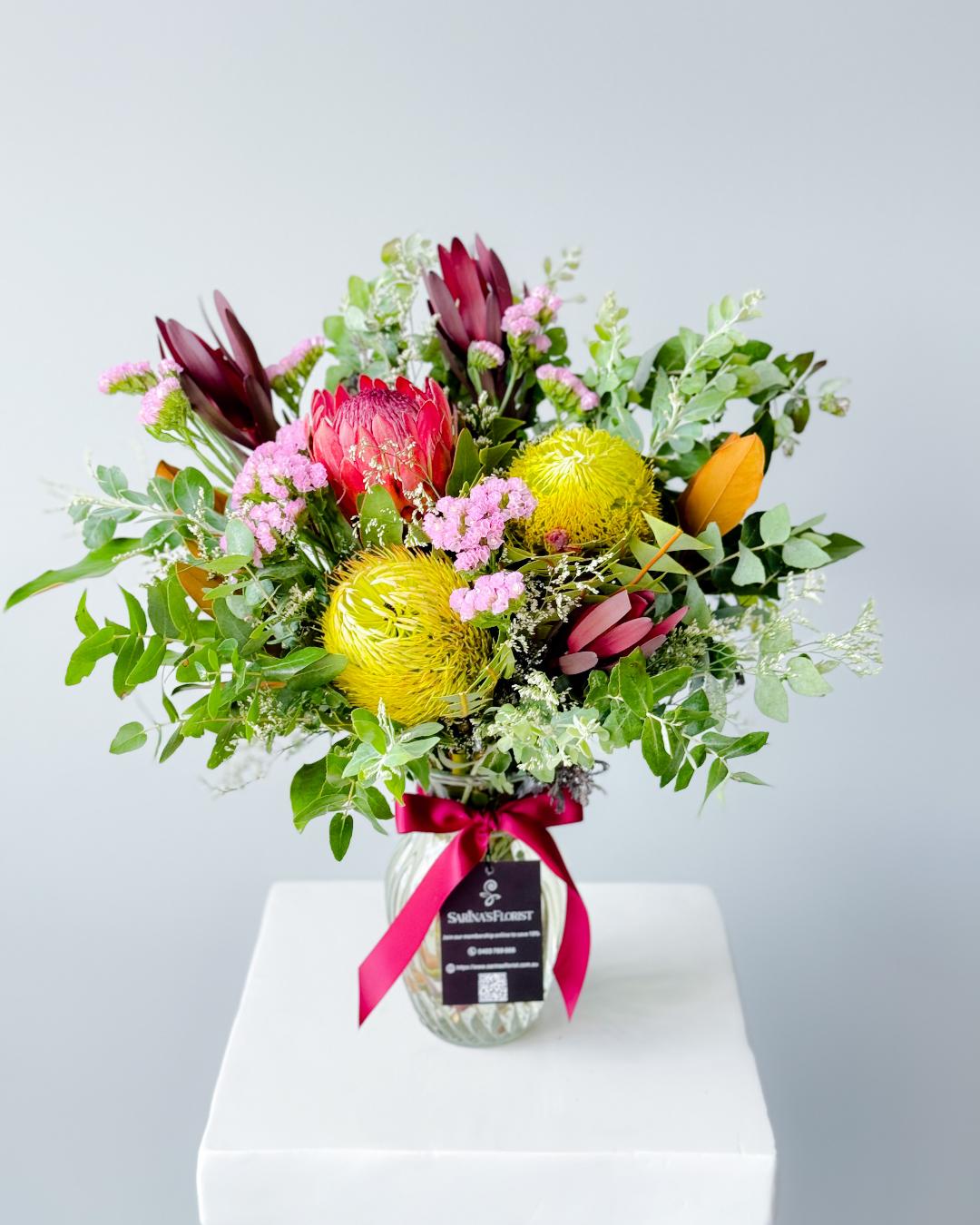 Native vase with seasonal pretty natives like protea, banksia, leucadendron and gum. Suitable for all occasions. Available in four sizes. The image shown is a Standard size.