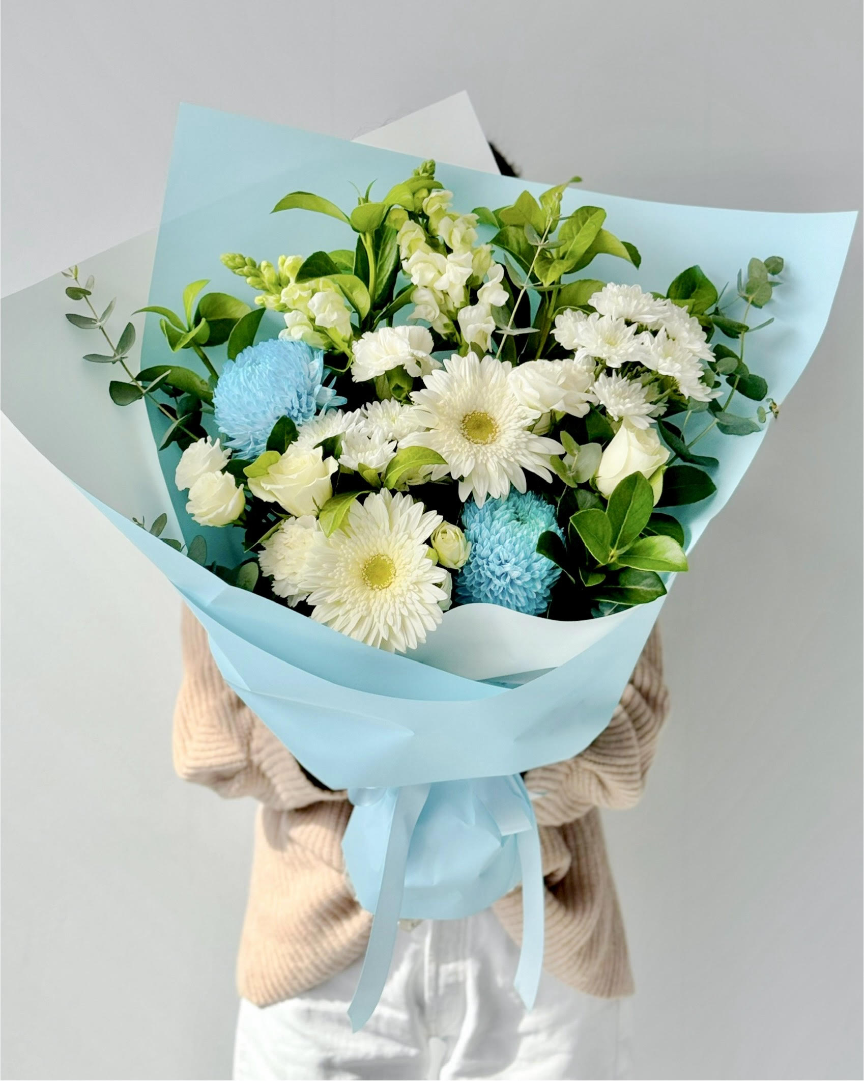 I believe bouquet with big Chrysanthemum, carnations, small rose, chrysies, white snapdragons, and seasonal greenery. Available in 3 sizes and 3 colors. The image shown is a Premium size.