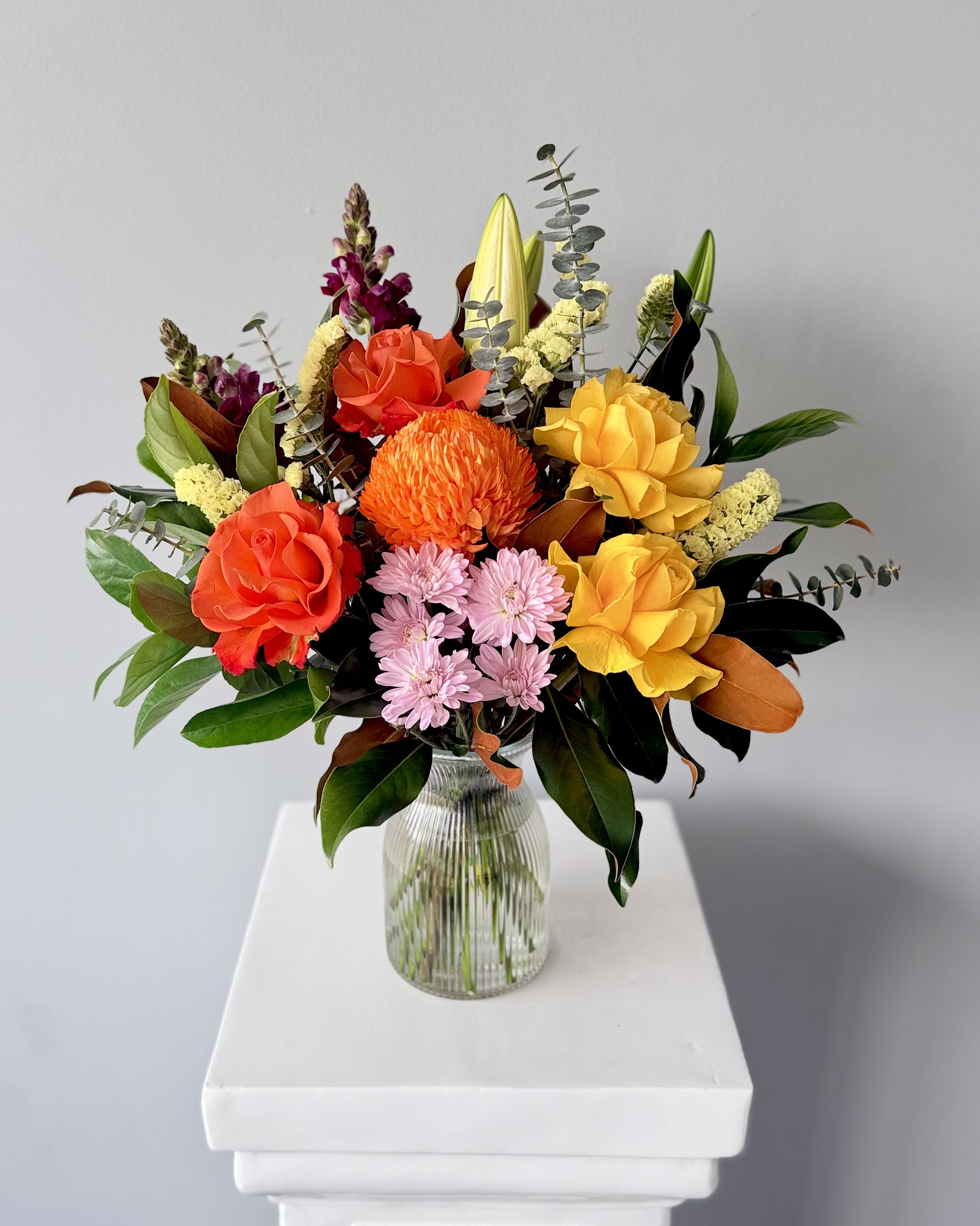 Seasonal Flower Vase with seasonal orange and yellow flowers and foliage.